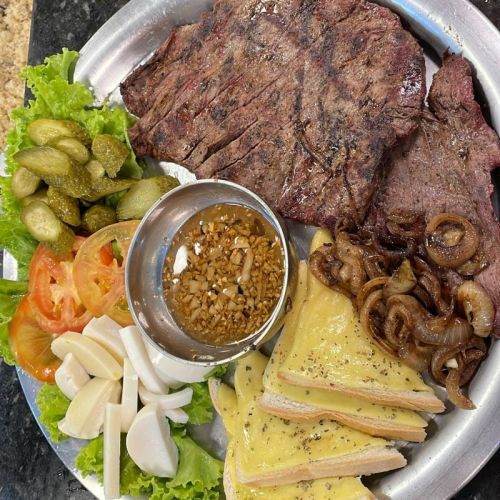 Pão com queijo, palmito, farofa, maionese, feijão, arroz, pepino, tomate e alface 440g carne - 500g batata